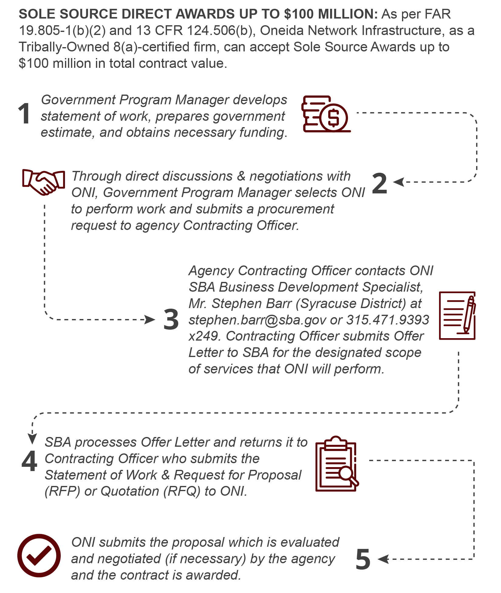 As per FAR 19.805-1(b)(2) and 13 CFR 124.506(b), Oneida Network Infrastructure, as a Tribally-Owned 8(a)-certified firm, can accept Sole Source Awards up to $100 million in total contract value.